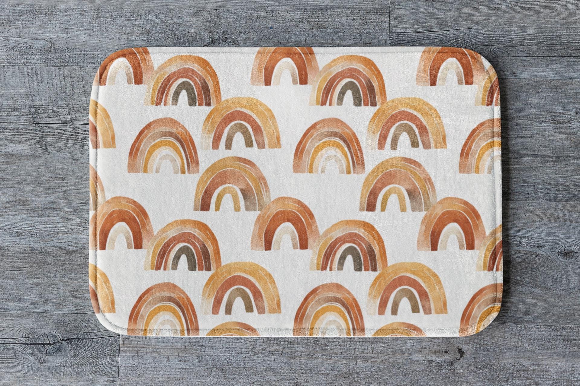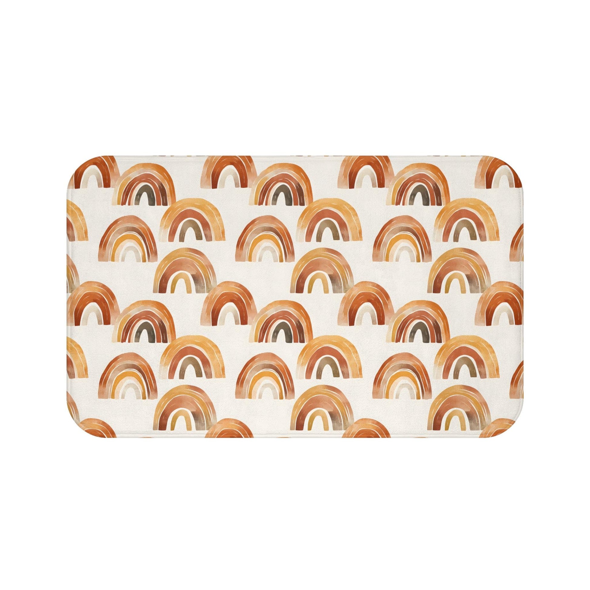 Warm up your space with this abstract boho rainbow bath mat, designed with earthy terracotta, mustard, and neutral tones. The modern rainbow pattern adds a cozy, grounded touch to minimalist or boho-style bathrooms.