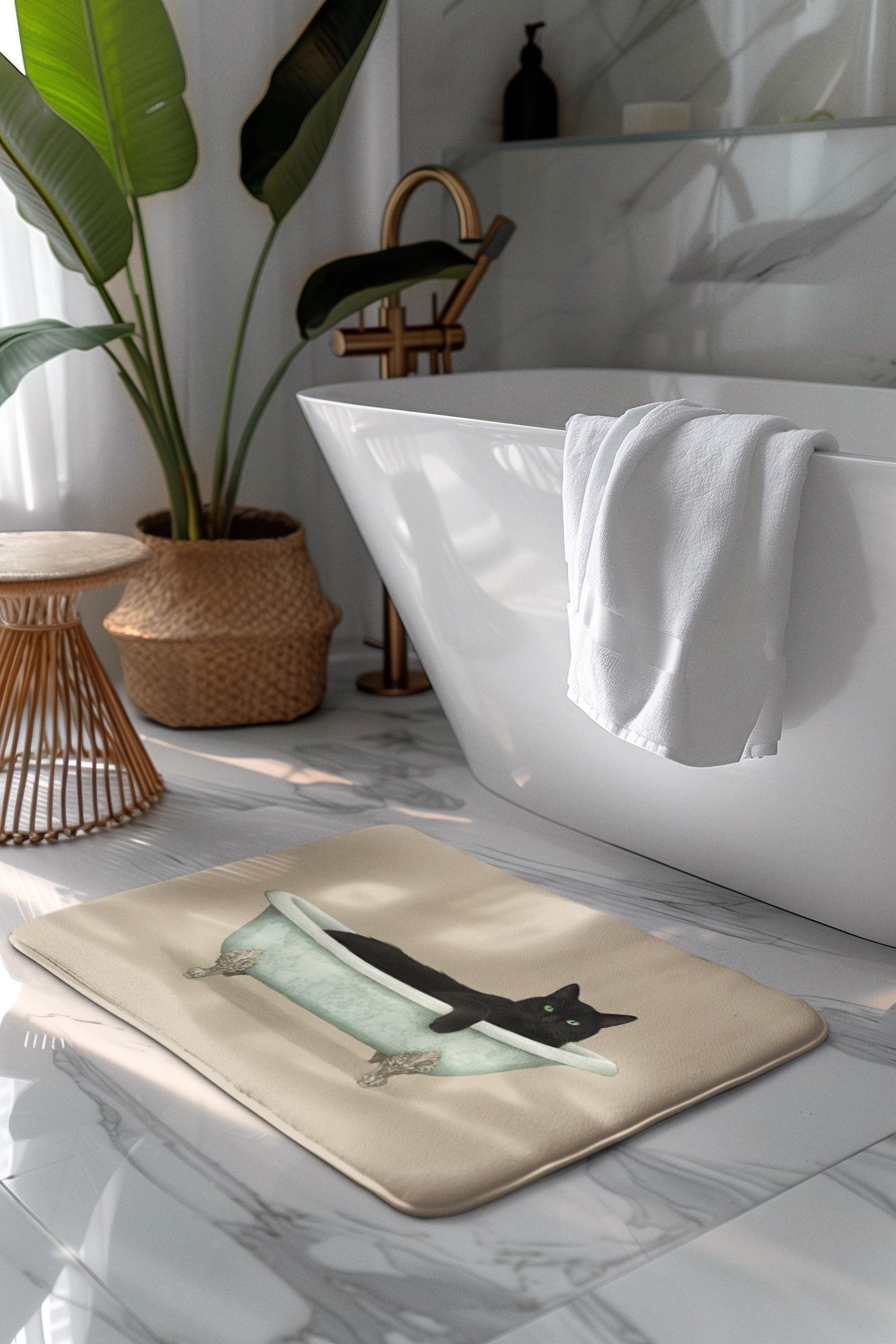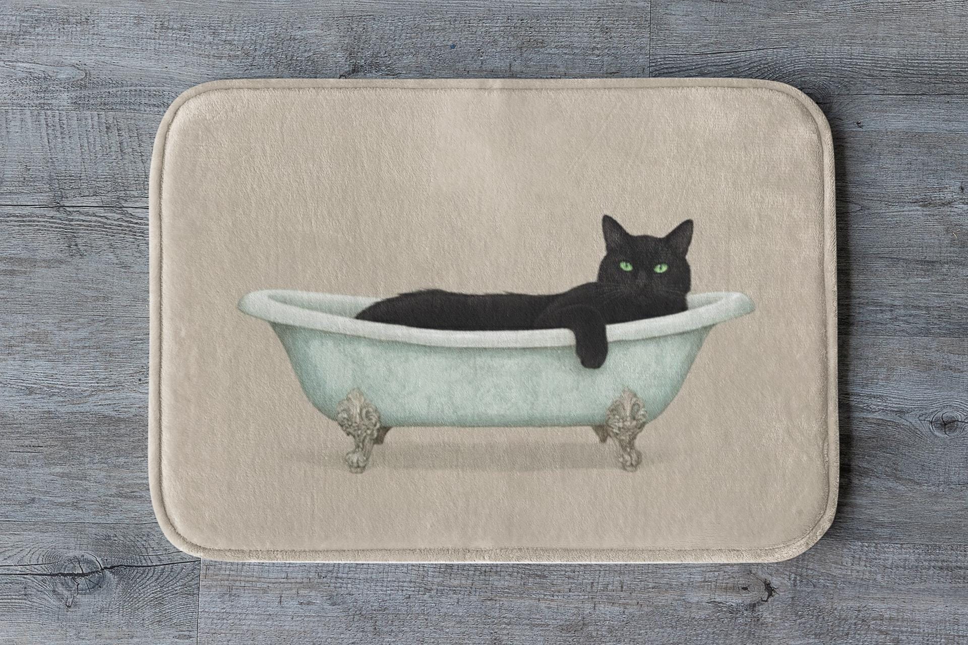 Bring mysterious charm with a sleek black cat and vivid green eyes lounging in a vintage tub. Perfect for Halloween or year-round witchy vibes. Soft, absorbent, and slip-resistant.