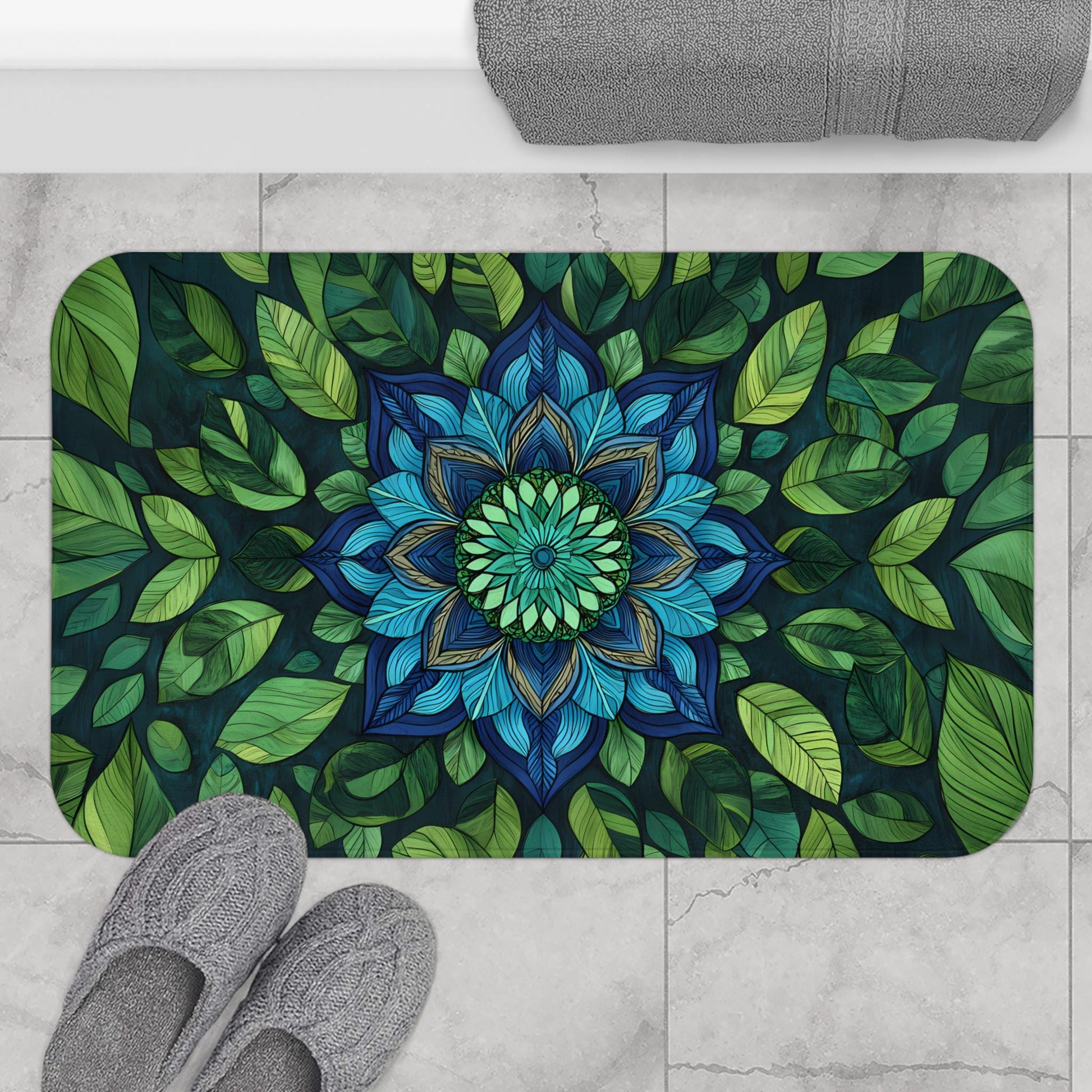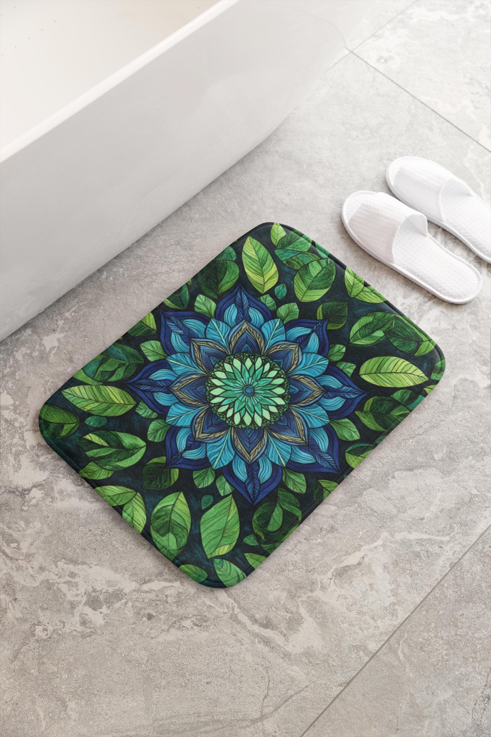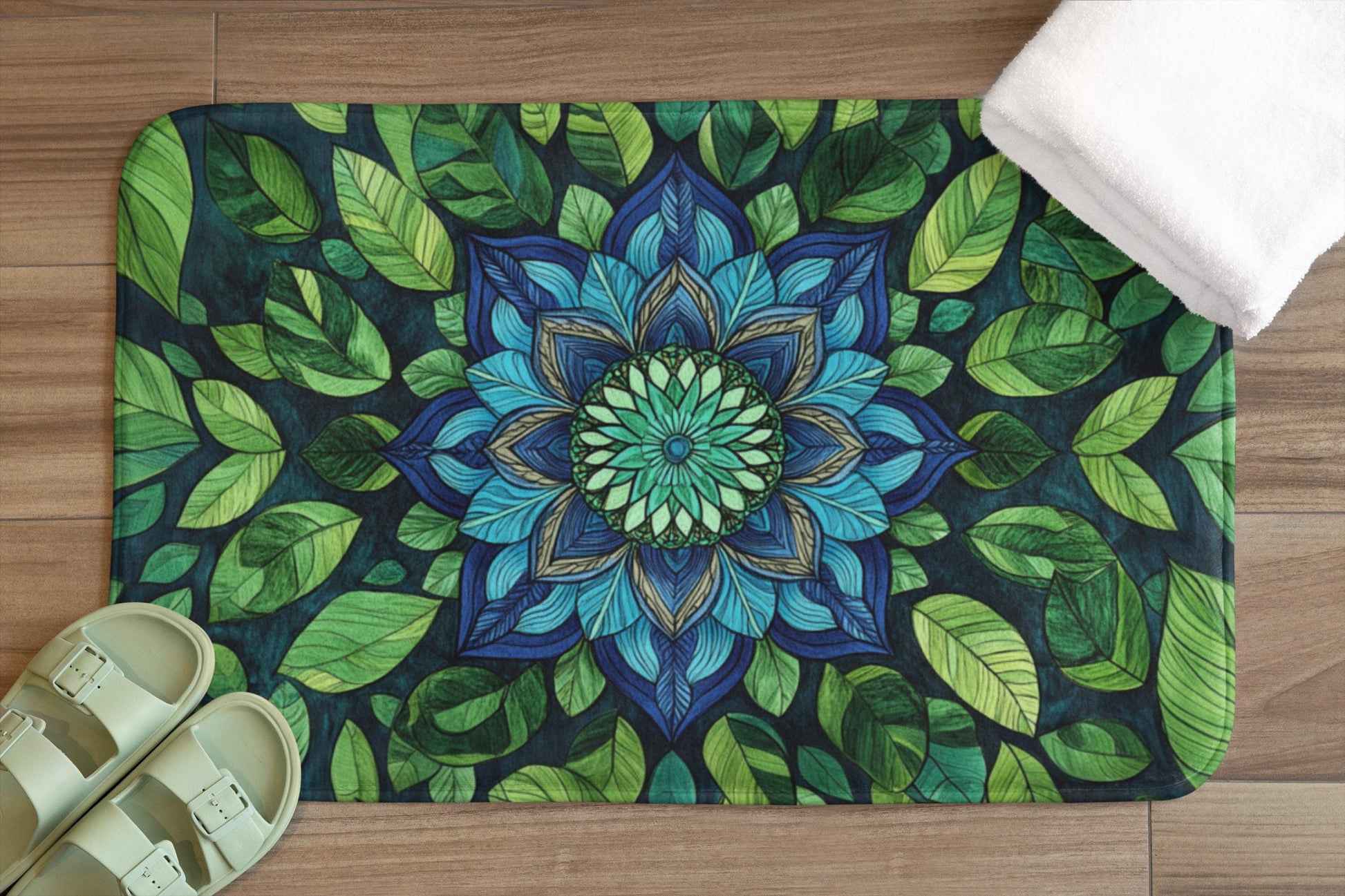 Blue Green Mandala Bath Mat – Boho Bathroom Rug with Sacred Geometry