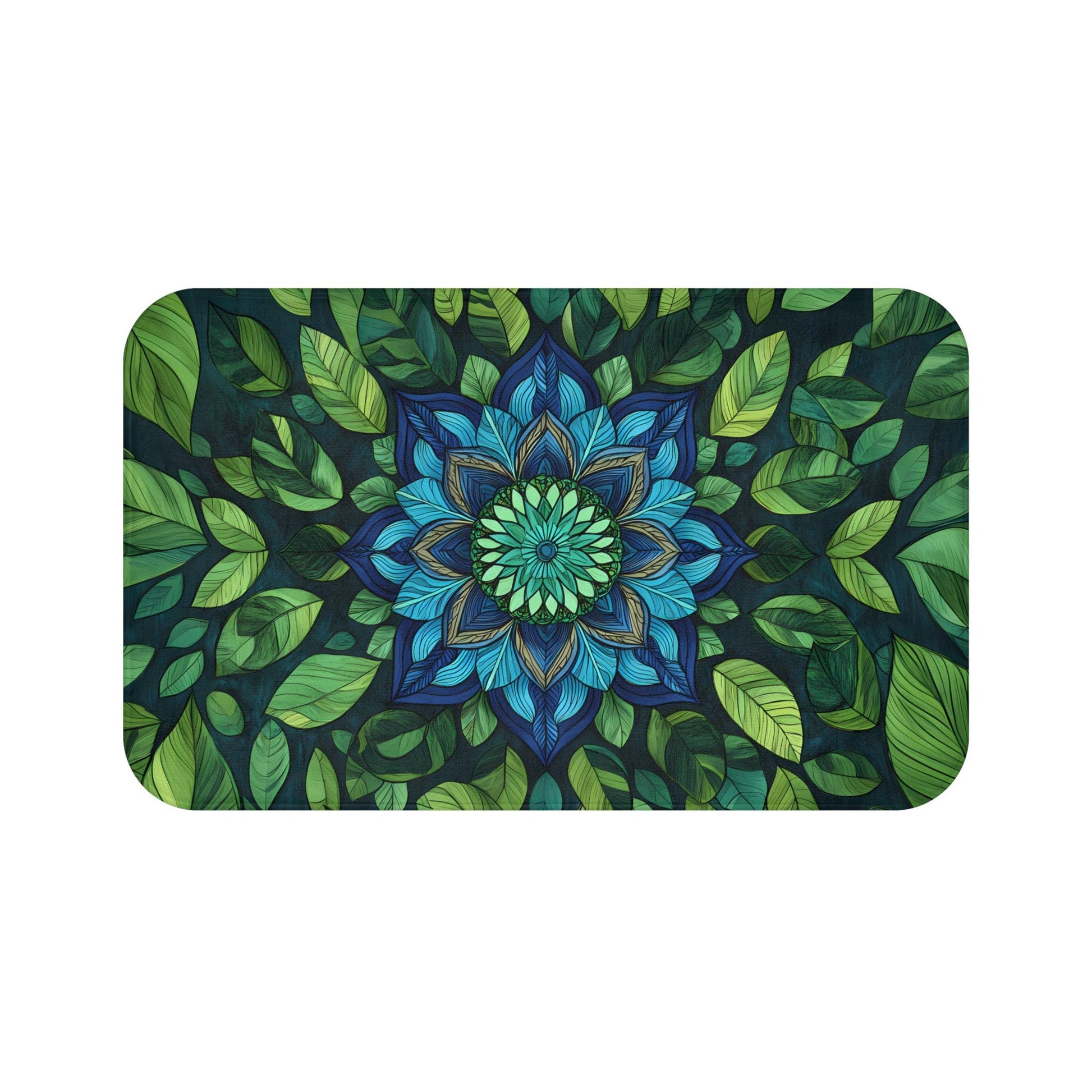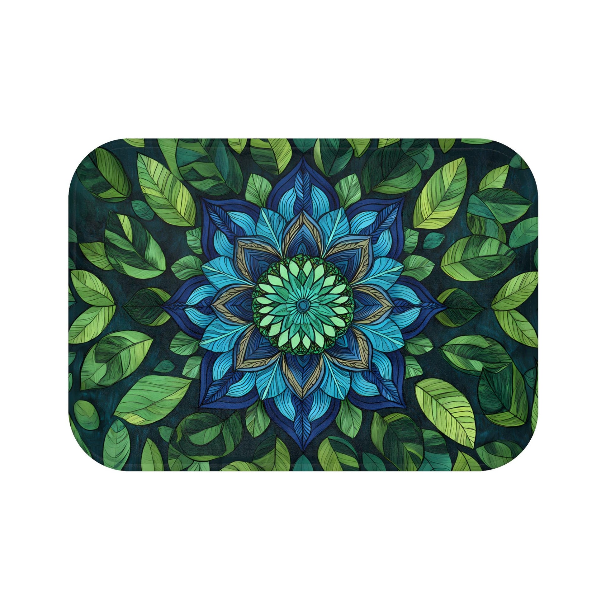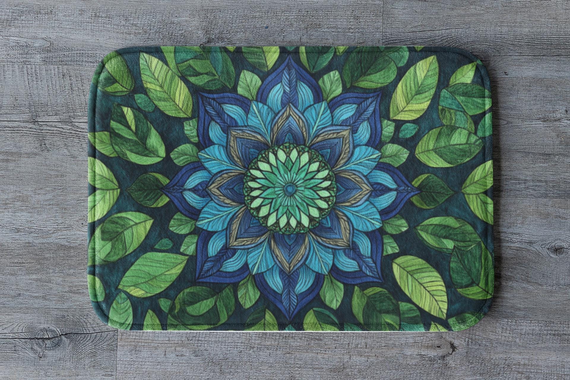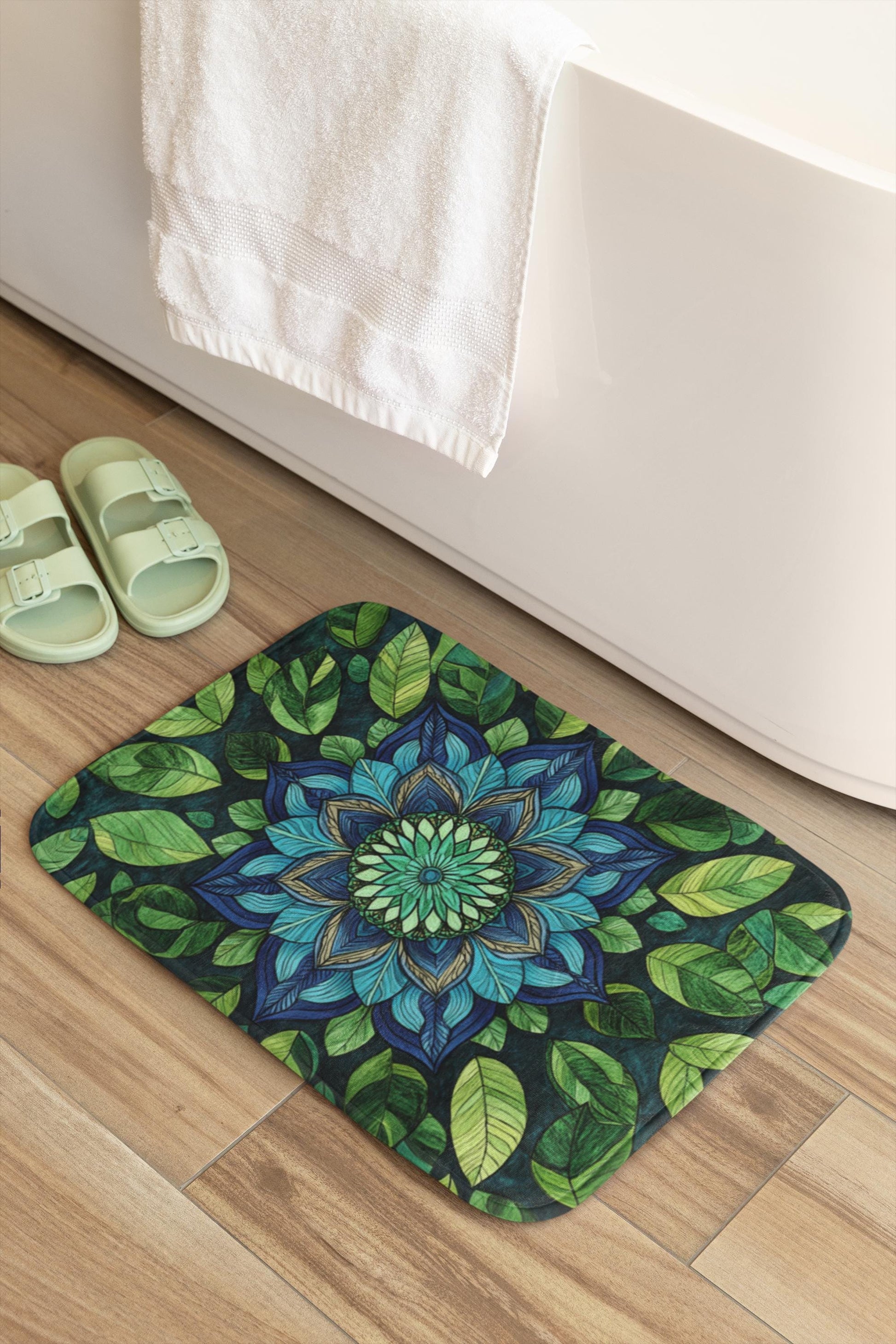 Blue Green Mandala Bath Mat – Boho Bathroom Rug with Sacred Geometry