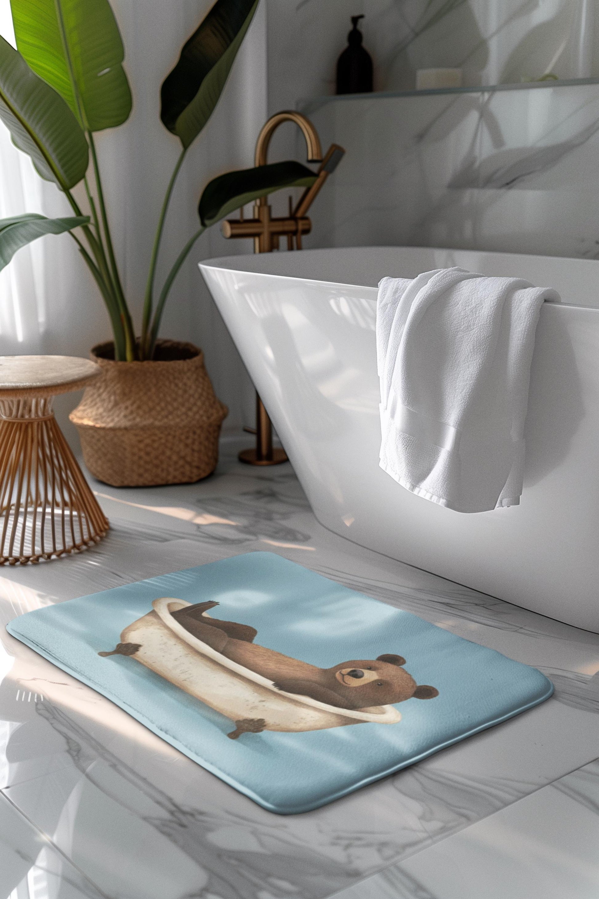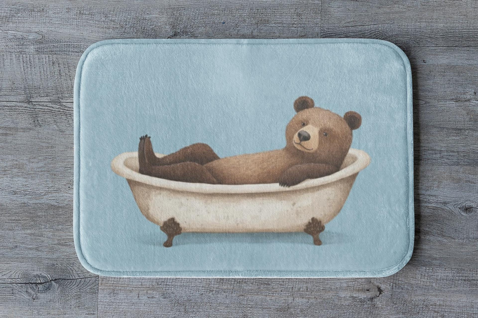 Cozy woodland charm meets whimsy with a relaxed brown bear soaking in a vintage tub. Ideal for rustic or cabin-inspired homes. Soft, absorbent, and slip-resistant.
