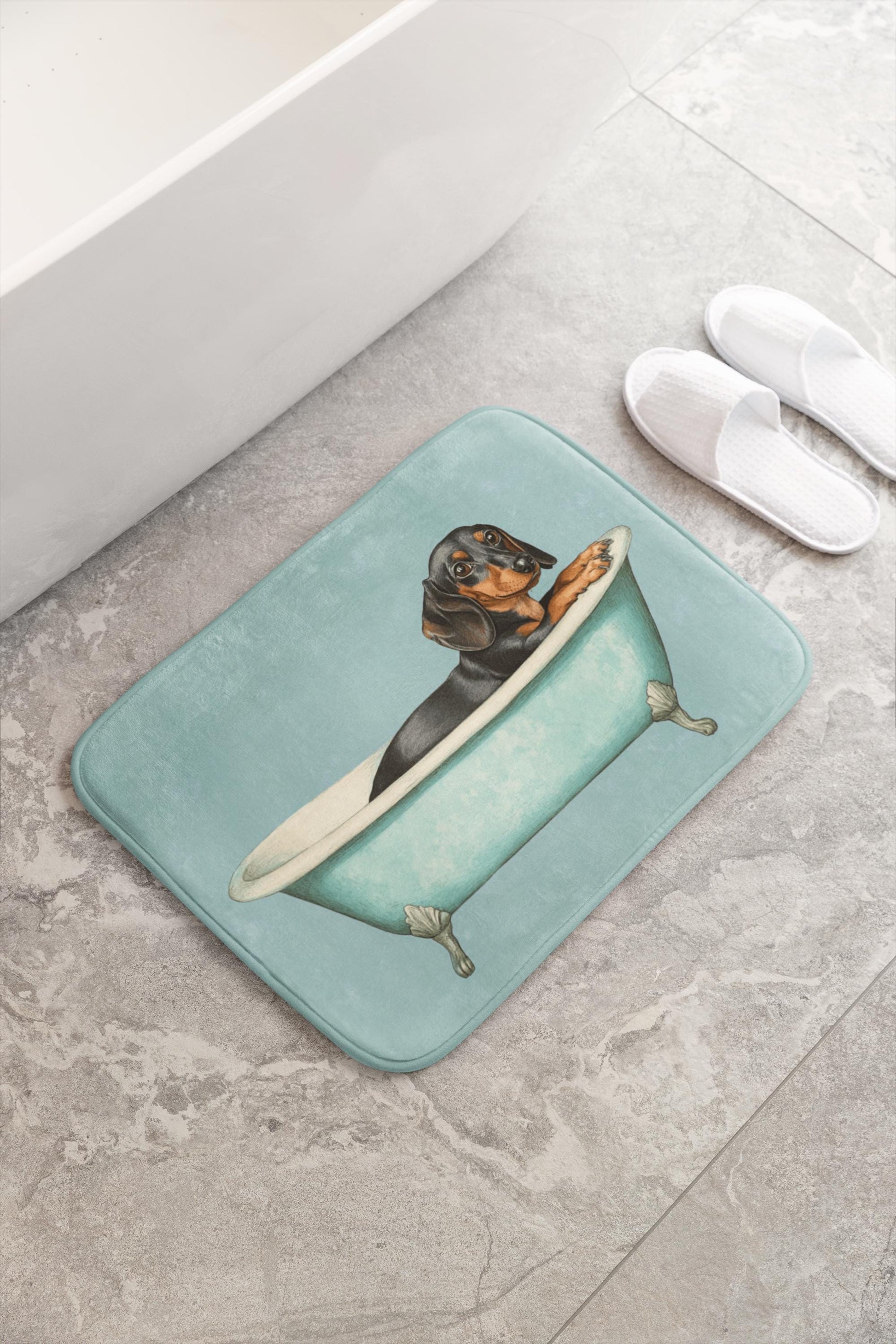 Bring joy to your bathroom with this adorable dachshund bath mat. Featuring a playful wiener dog illustration, it adds warmth and personality to your space—perfect for dachshund owners and dog lovers alike. Soft, absorbent, and slip-resistant for everyday comfort.