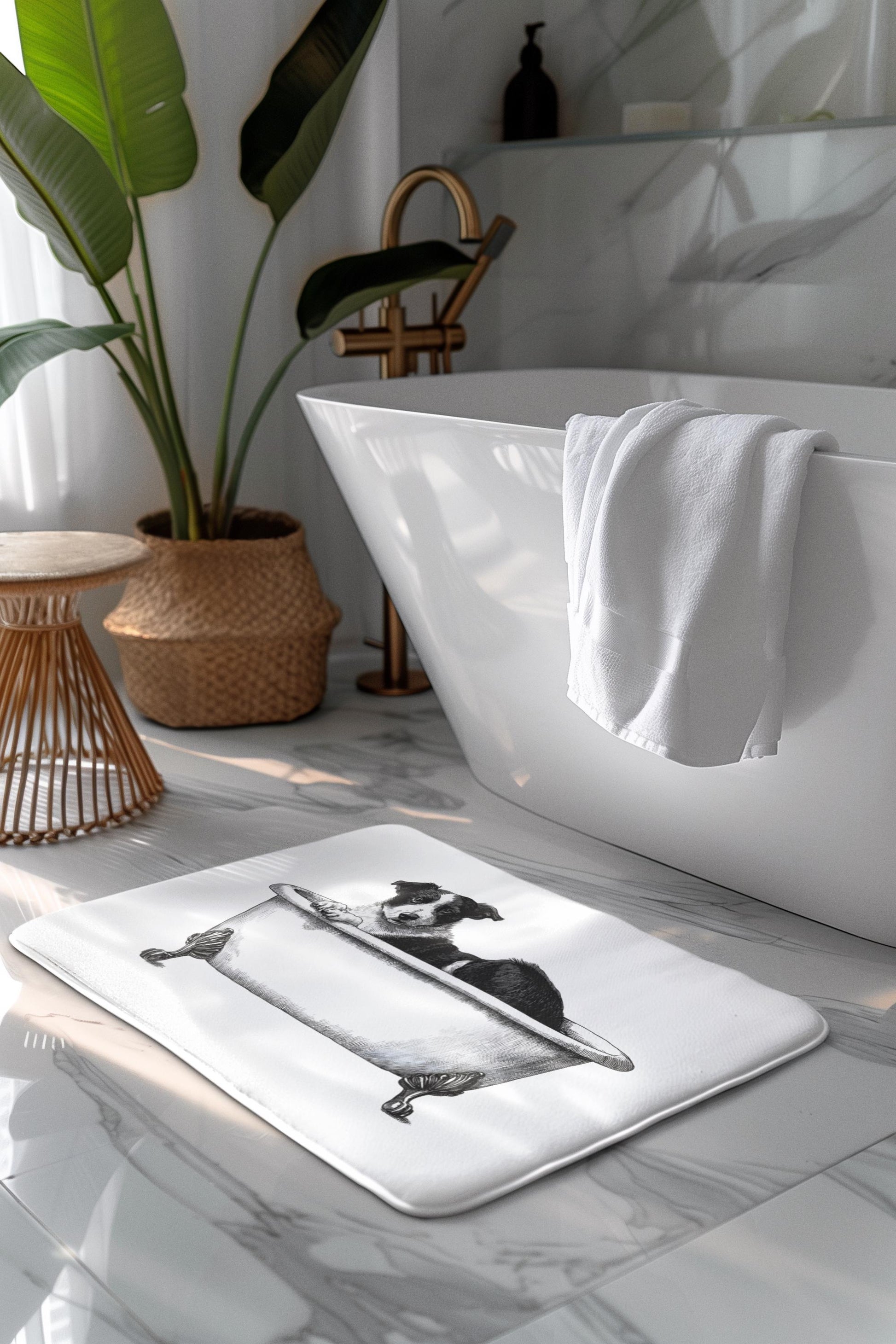 Add charm to your bathroom with this adorable dog bath mat. Featuring a playful black and white pup design, it’s perfect for dog lovers who want to bring personality and warmth into their space. Soft, absorbent, and slip-resistant, this mat combines comfort with functionality.