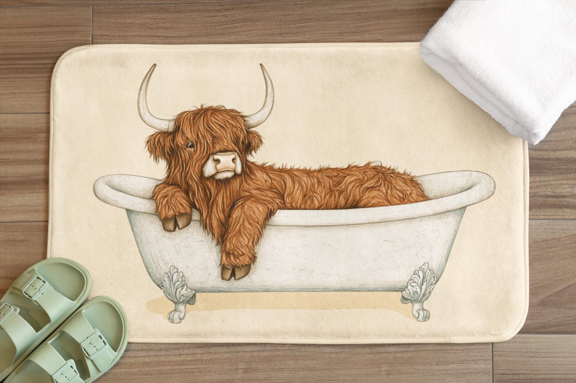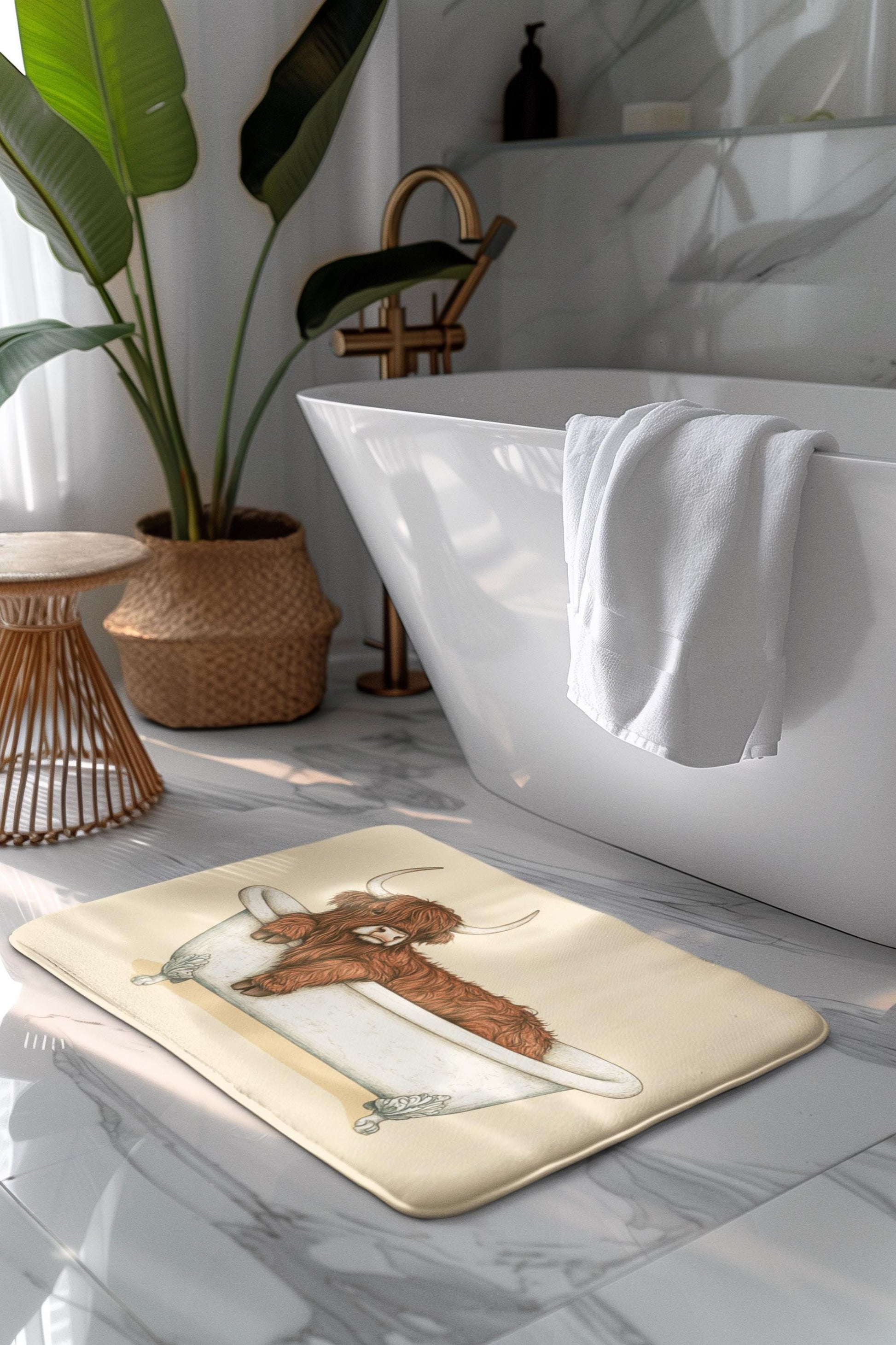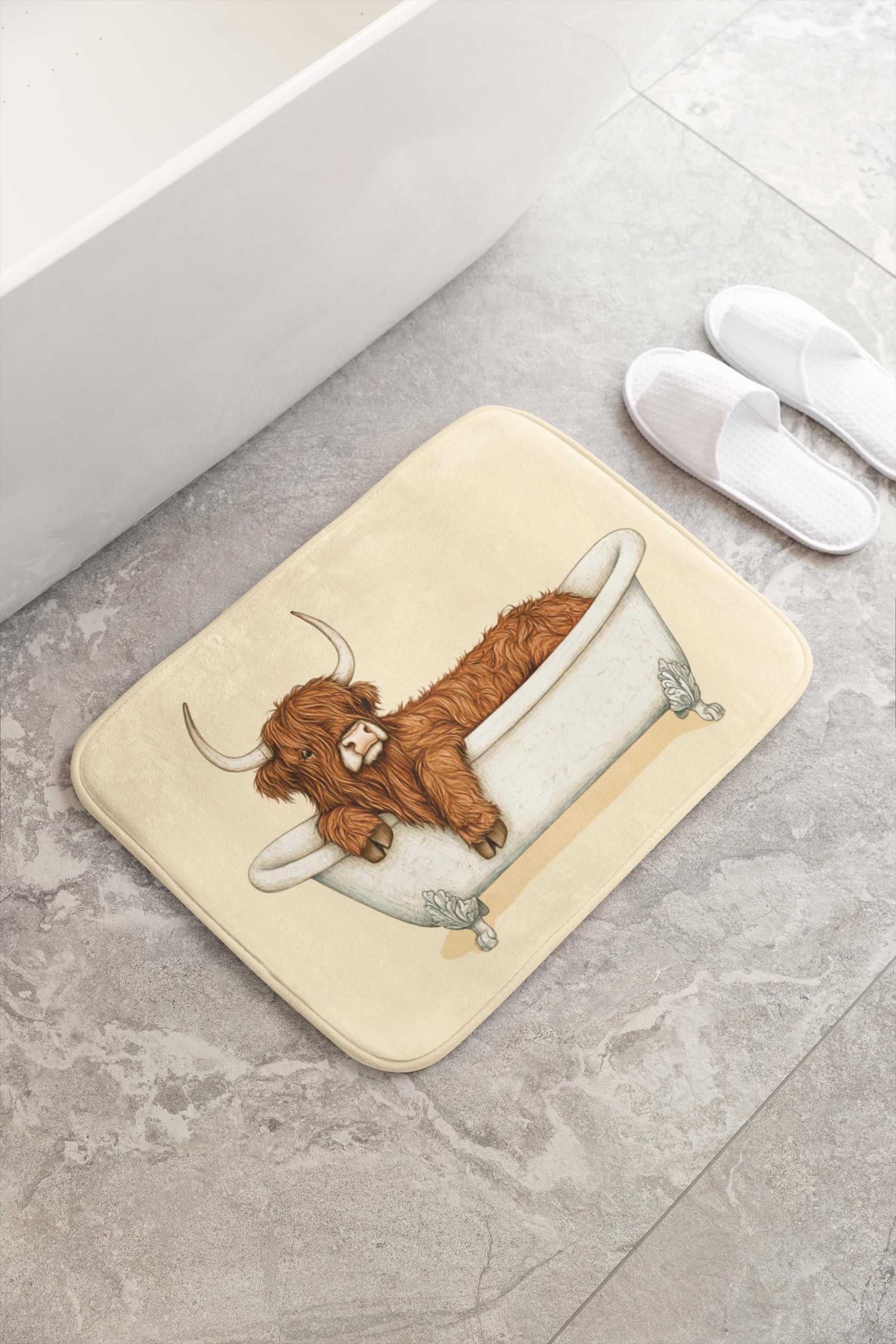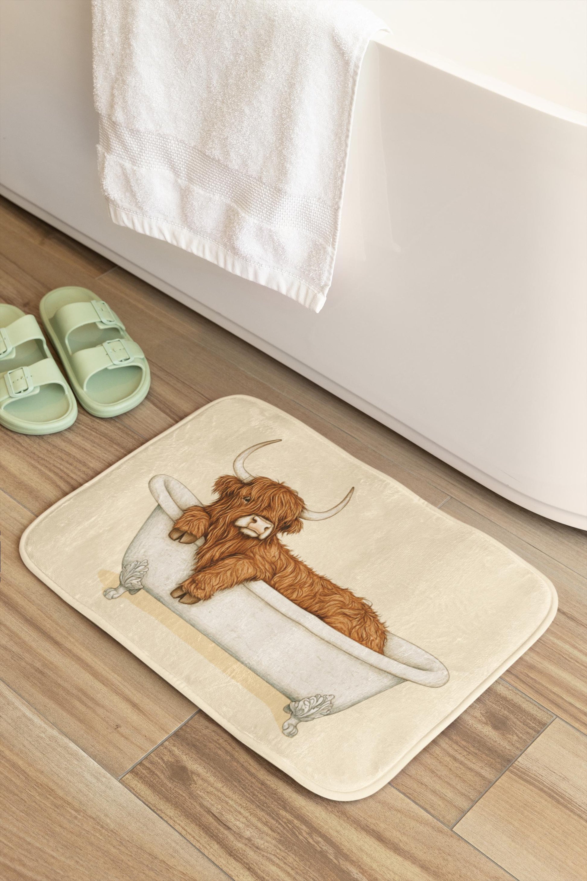 Bring a cozy countryside vibe into your bathroom with this Highland Cow bath mat. Featuring a rustic and charming design, it’s the perfect accent piece for farmhouse-style homes and animal lovers alike. Soft, absorbent, and durable, it adds both comfort and character to your daily routine.