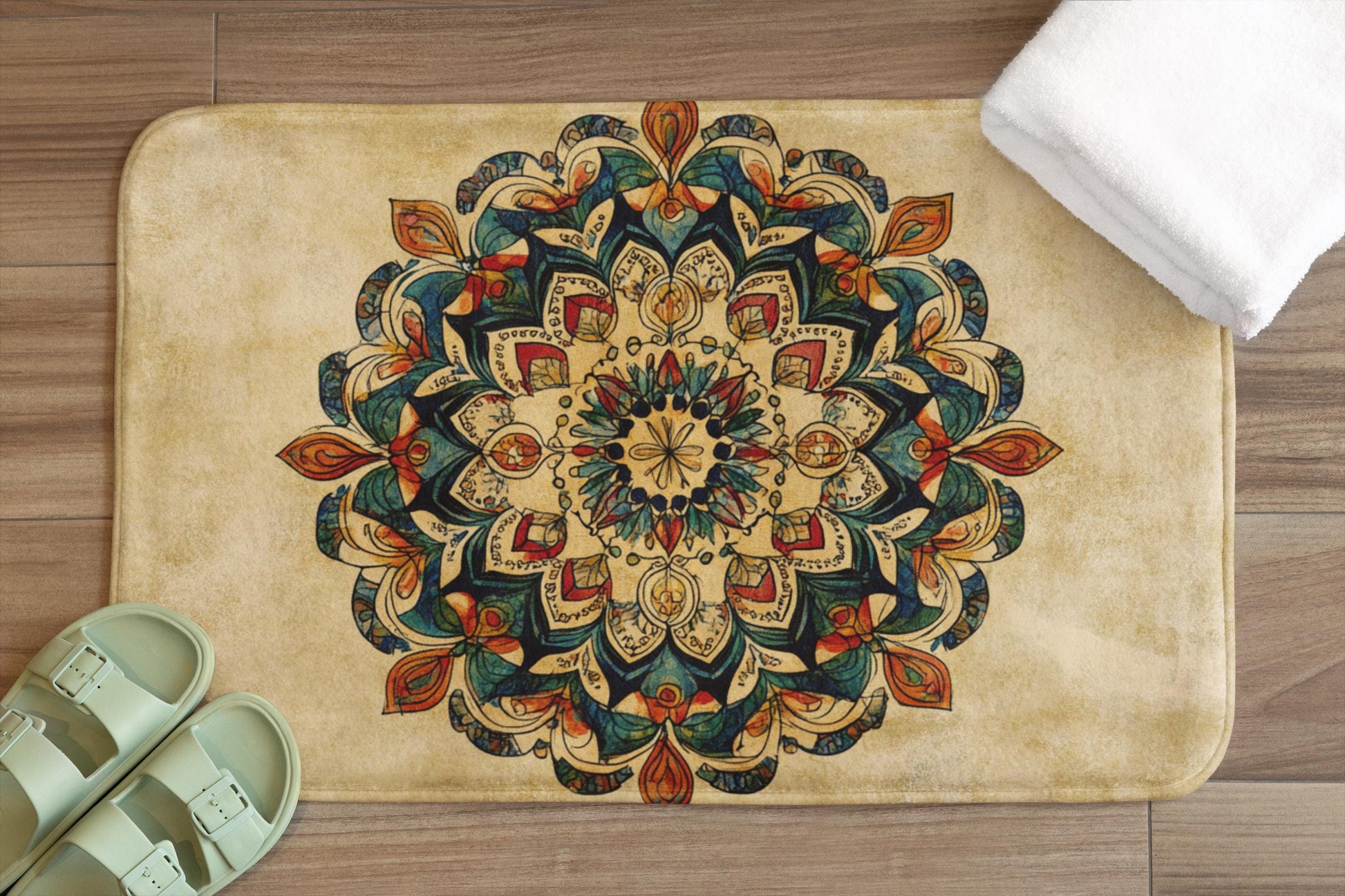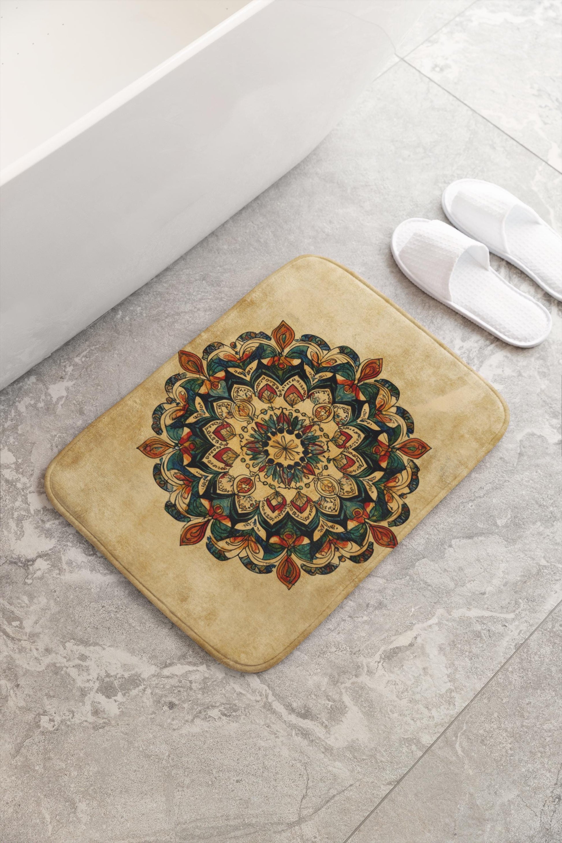 Brighten your bathroom with this vivid mandala bath mat in bold, uplifting hues. Perfect for boho and creative spaces, it adds a joyful focal point that feels both artistic and serene. Soft, absorbent, and slip-resistant.